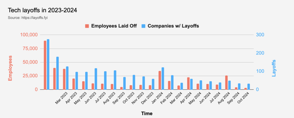 Then, there’s the layoffs, which have impacted us heavily in tech. Even though they have (somewhat) slowed, around 165,000 tech workers were laid off in 2022. Another 262,000 tech employees lost their jobs in 2023 and, as I’m writing this, the current count for 2024 is 142,532.