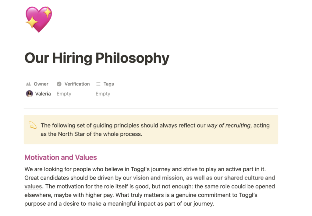 🗿 Create a Hiring Philosophy. This is your guiding principles which should always reflect your way of recruiting, acting as the North Star of the whole process to keep you on track. Toggl’s Hiring Philosophy lays out our motivations, values, equal opportunity goals, and long-term planning to keep our People Ops department on the same page.