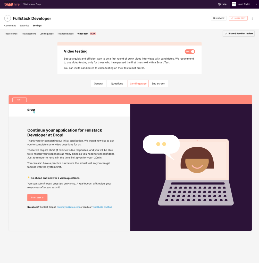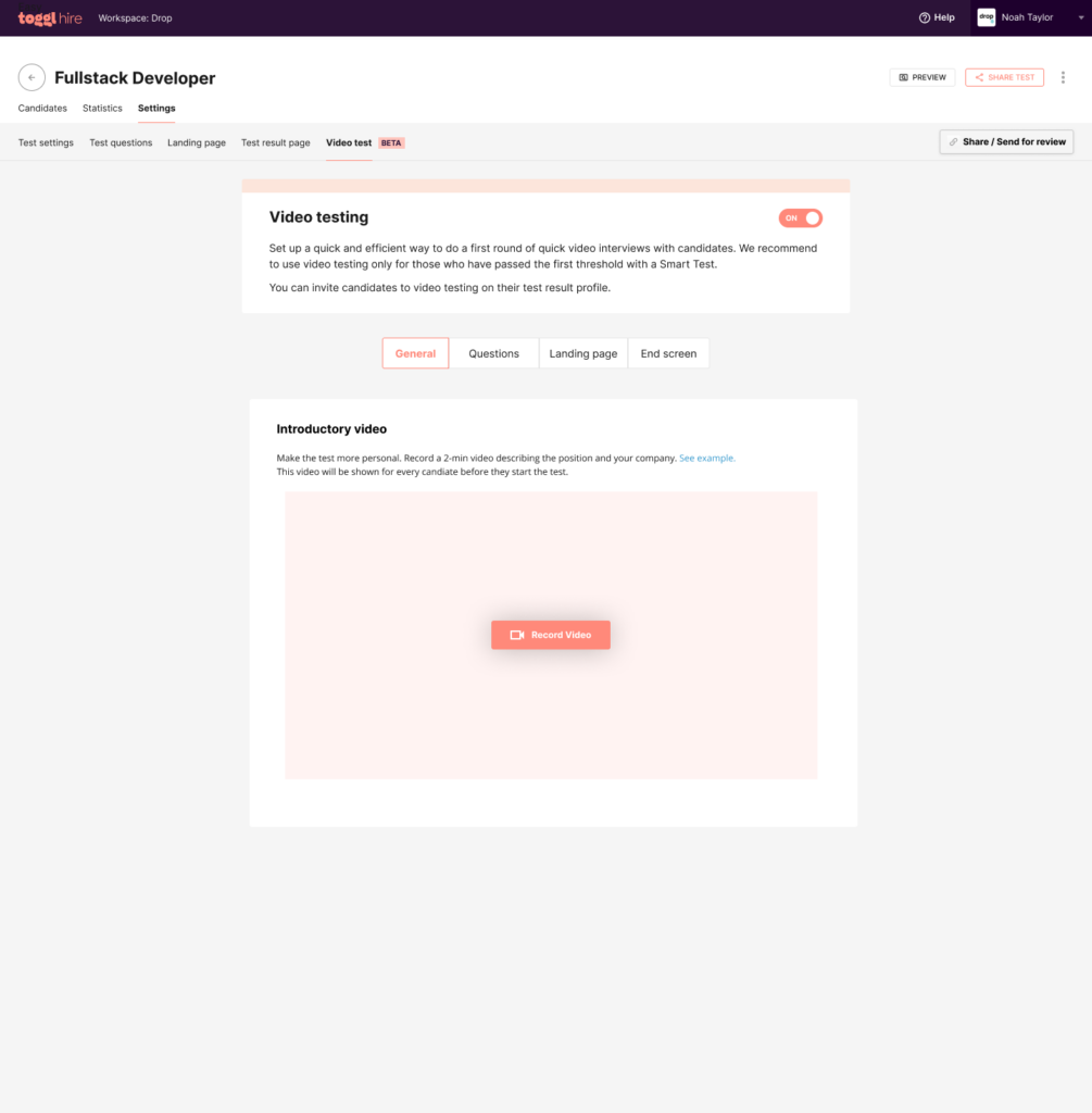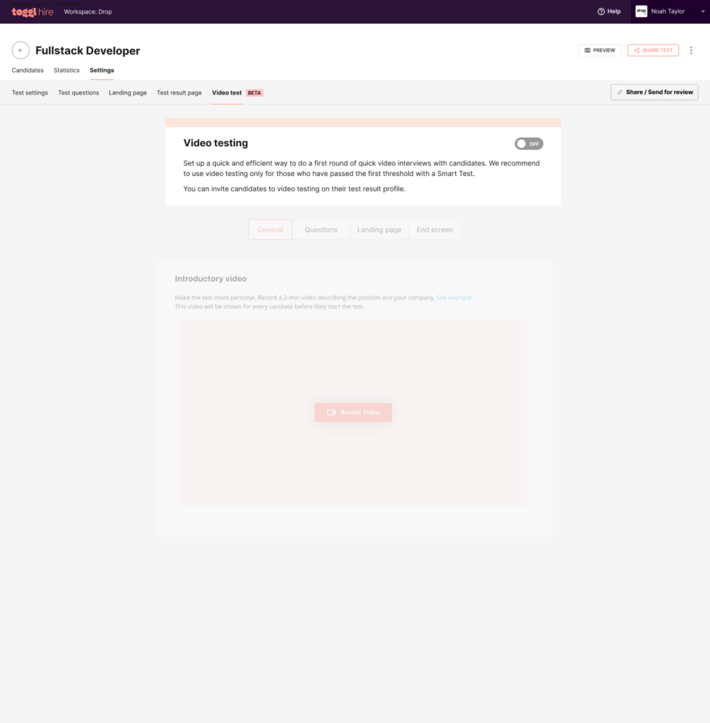 It all starts inside the Toggl Hire dashboard for hiring professionals. To get started, go to the ‘Video Test’ tab and turn on the Video Testing feature.