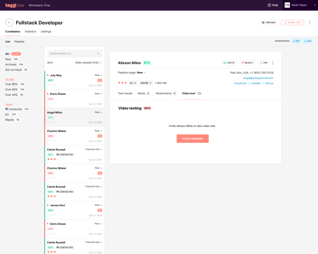 Now that your Video Intros are all set up, it’s time to let candidates join the party. The great news is that it’s super easy to do straight from your Toggl Hire dashboard. Simply find the right candidates and invite them to take the video test.