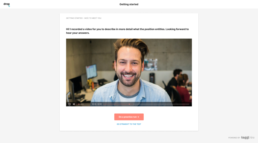 It also helps recruiters and hiring managers introduce the position and company in a compelling yet scalable way, as the same video recording is distributed to all candidates. This way, the experience is as close to a structured ‘normal conversation’ as possible for all parties.