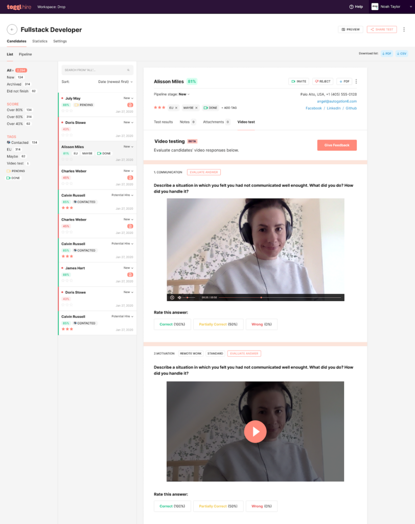 • For the hiring team:  the same video intro recording can be distributed to multiple job candidates. And you don’t need to wreck your brain for relevant interview questions. Simply dip into our pool of pre-suggested soft skills or behavioral job-specific questions and invite candidates to record their answers. When answers start rolling in, you can review, rate, and add notes in your own time.