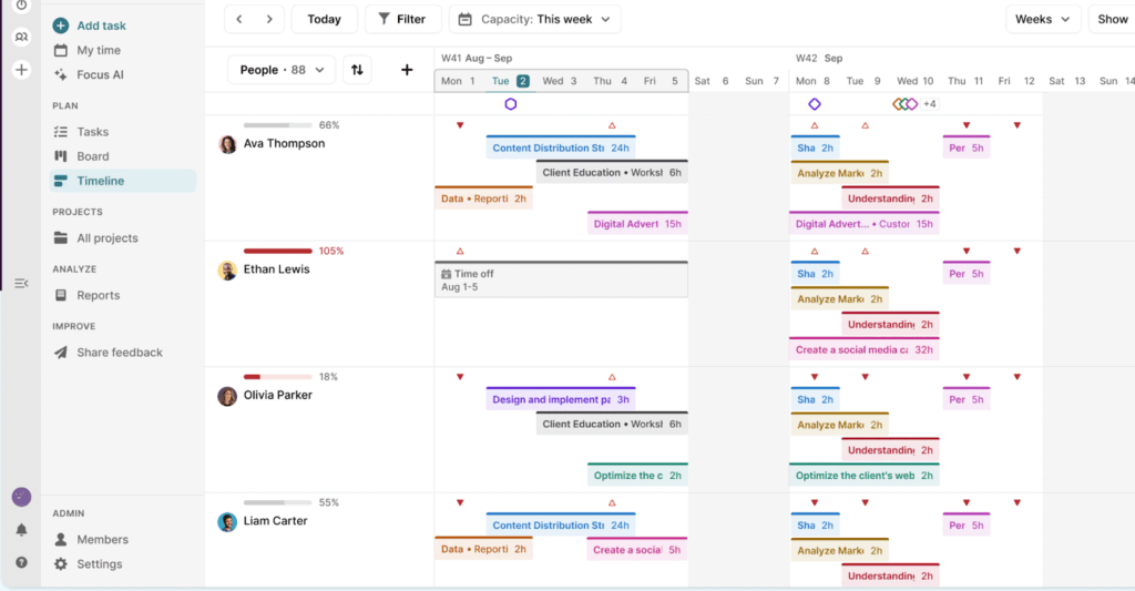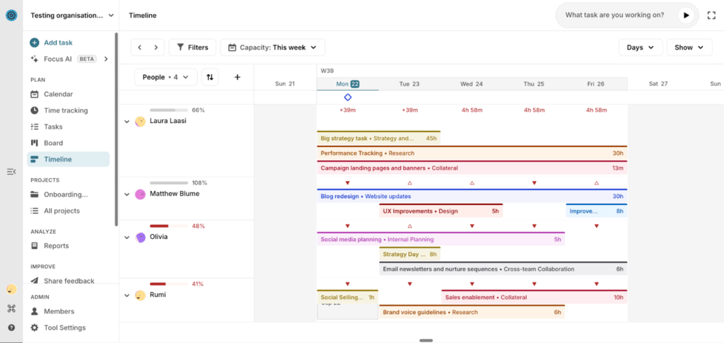 If you struggle with resource allocation and task management, take a look at Toggl Focus. It allows you to plan projects visually, using your team’s time-based insights.