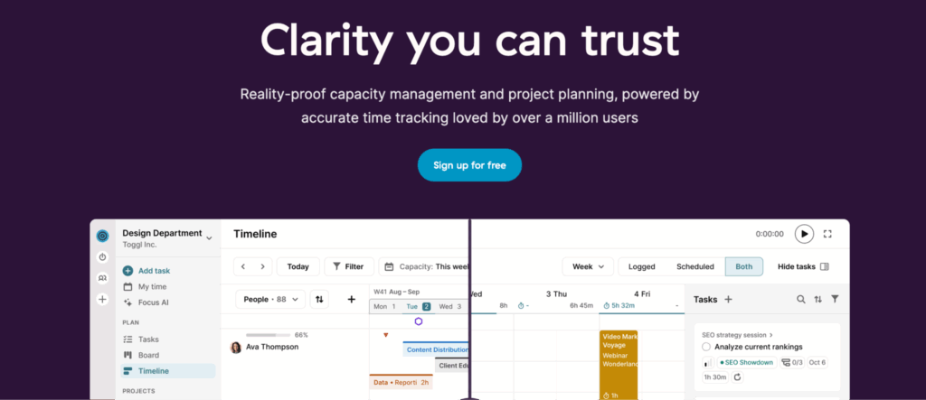 Toggl Focus helps teams build this kind of environment. Our tool combines task management, resource planning, and time tracking in one attractive workspace. Everyone’s priorities and capacity are immediately visible, and scope perfectly matches the planned timelines and allocated budgets.