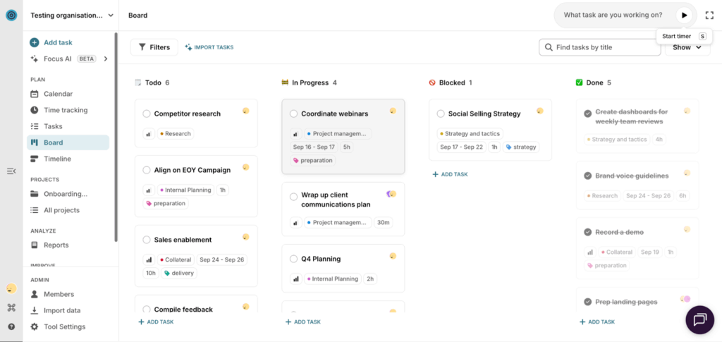 Place selected sprint tasks on a Kanban board or on a timeline, both saved as templates (and with Toggl Focus, you can actually switch between these two views anytime).