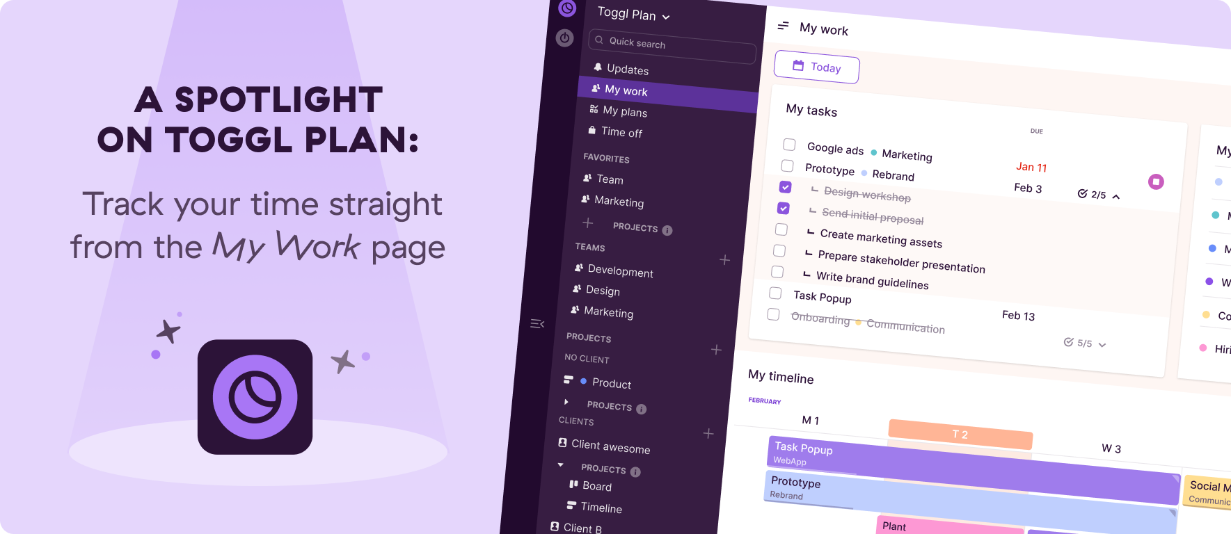 Toggl offers more than Hire! Toggl Plan is a simple, visual way for agencies and internal teams to balance team capacity and project workloads. Use it to visualize and optimize your team’s capacity while ensuring everybody is aligned and informed.