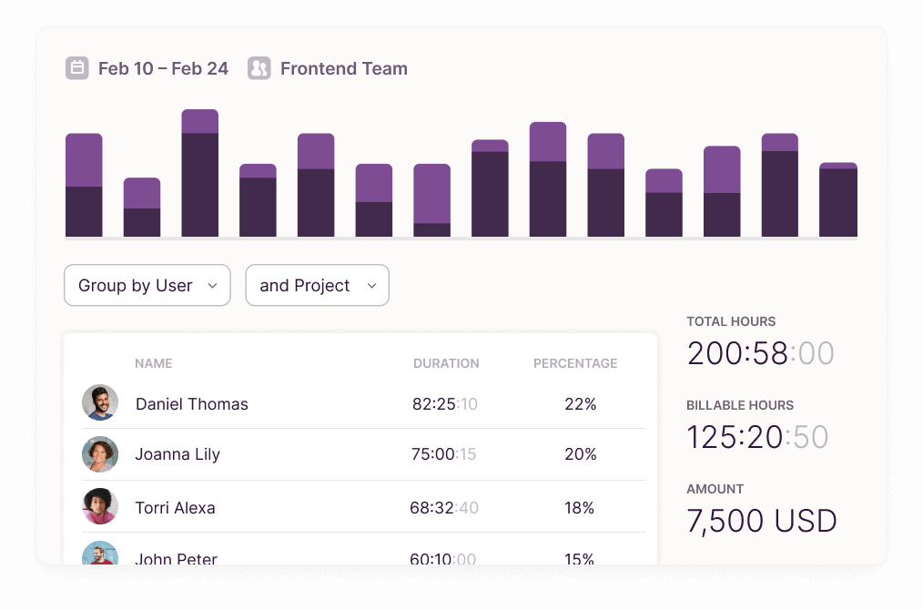 Using Toggl Track, you can track time and generate reports to see your team’s actual workload.