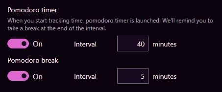 Toggl Track helps you implement time blocking using a number of ways. For example, in the desktop app, you can use the built-in Pomodoro timer to block time for work and break intervals.