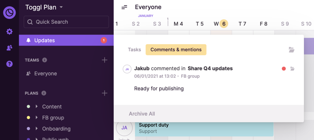 By default, you follow tasks that you create or that are assigned to you. You can also manually (un)follow tasks one by one form the task popup or in bulk by (un)following whole Plans and Teams. - Comments & mentions – here you’ll see if someone @mentions you, or replies to a comment thread you’re part of.