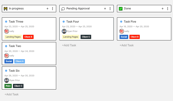 When you use Kanban, you can create custom columns. In the example screenshot above, a graphic design agency is using columns to identify which tasks are in progress, which are pending approval, and which are done. Tags are used to differentiate between different types of design (print, social, web, and so on). Using these boards can help you spot bottlenecks in your process, so your team can improve.