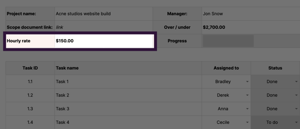 Once you’ve completed the project and tracked time against all tasks, the total project cost and profit will be displayed at the template’s bottom (and top).