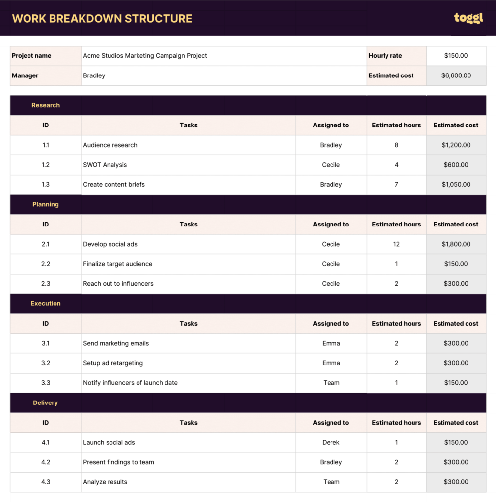 Feel free to use our WBS template, which contains fields to enter each task’s estimated hours and costs. Once filled out, this will create an estimated cost estimate for the entire project.