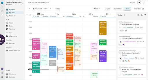 Toggl Focus was made for design teams that want workload clarity, estimation accuracy, and calm project delivery. Unlike other platforms on this list, time tracking is front and center of the platform, so you can feel 100% certain that the real-time capacity outlook you’re viewing is actually accurate. Toss in real-time budget tracking and effortless reporting, and you have everything you need to deliver creative work without drowning in admin.