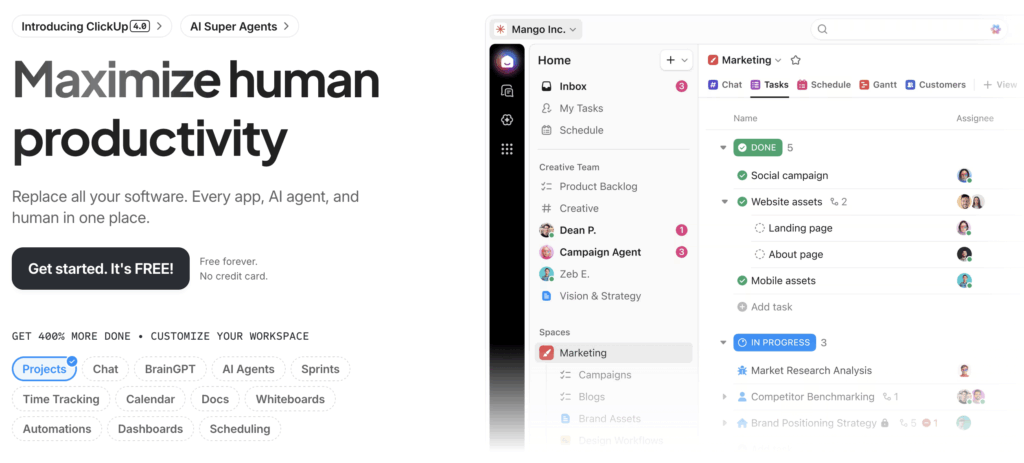 - Create and manage tasks with Kanban, Gantt, list, and calendar views