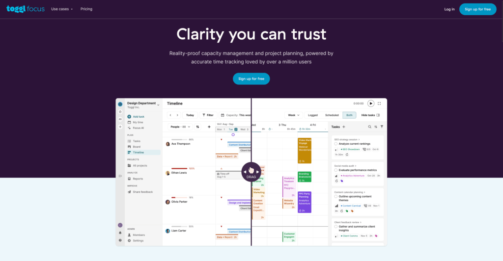 Toggl Focus is the powerful but simple project management and capacity management tool. It gives you everything you need to plan, track, and deliver amazing projects, all powered by reliable time data.