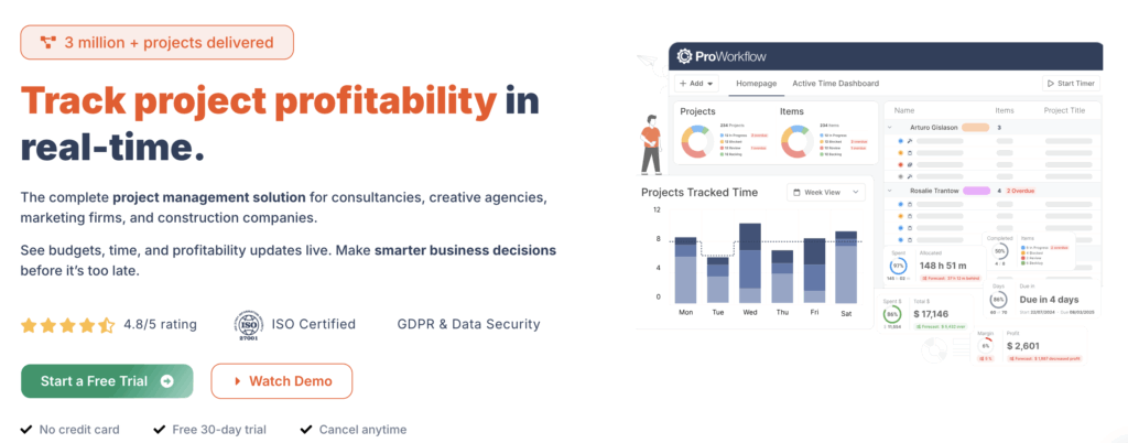 Think of it as your project team’s ecosystem. It’s a centralized place for you to plan, track, and deliver your projects from start to finish, using features such as planning, task management, and time tracking. Instead of hunting through messy email threads or outdated spreadsheets, it gives everyone a single source of truth for what’s happening and when.