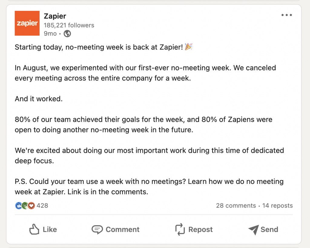 For example, during the summer, the company posted the results from its first “no-meeting week,” during which 80% of the team achieved their goals and gave others a meaningful look into the company culture.
