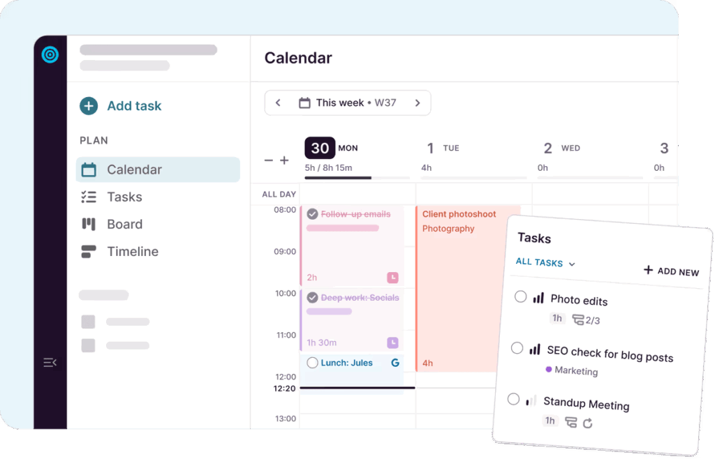 • Visual overviews: Color-coded tasks, team timelines, and overview panels clearly show everyone’s schedule and capacity.