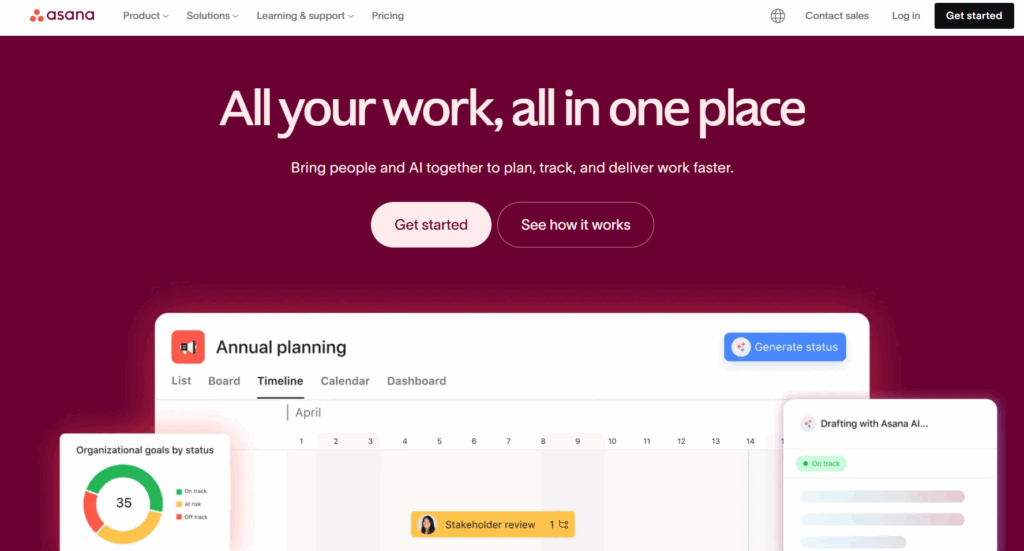 - Visual clarity across multiple views — calendar for daily focus, boards for workflow, timelines for longer planning