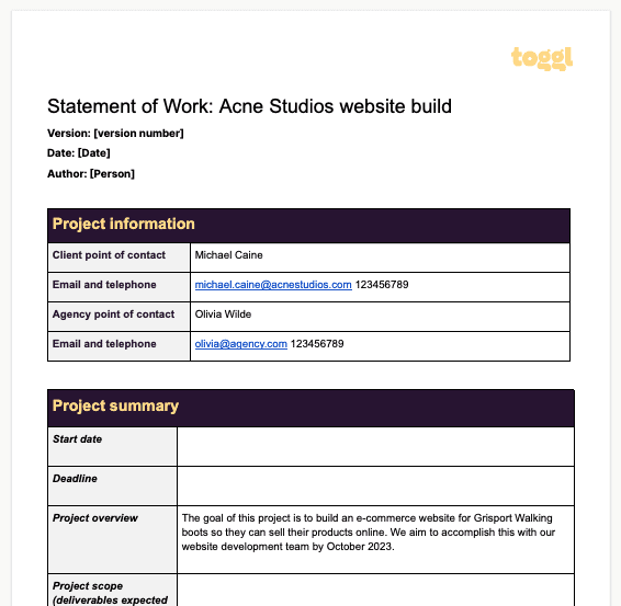 But like all things in project management, creating a SOW, managing your time, and co-ordinating your to-do list is easier with the help of expert software tools. Toggl Track is an all-in-one time and task management tool that keeps you and your team aligned on progress while monitoring how long each deliverable takes to complete.