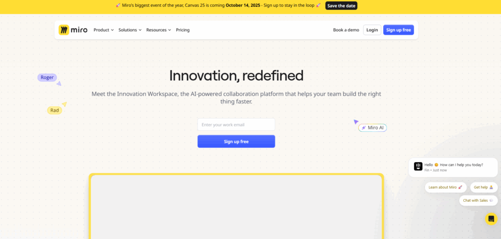 Starter $8 per user/mo Unlimited boards, unlimited visitors, Miro AI.