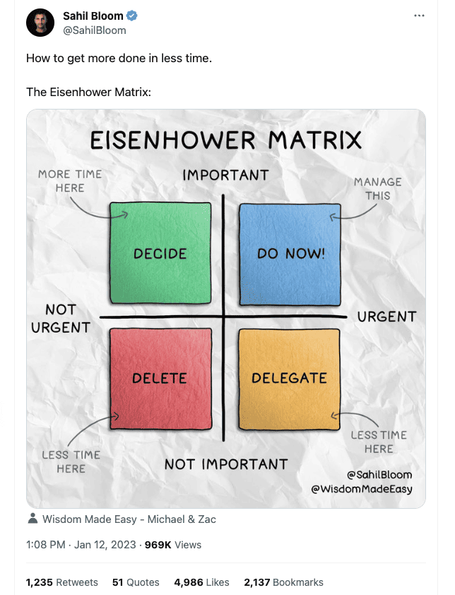 If you’re trying to accomplish too much, prioritize your work using an Eisenhower matrix or the 4 Ds of time management: Do, Defer, Delegate, and Delete.