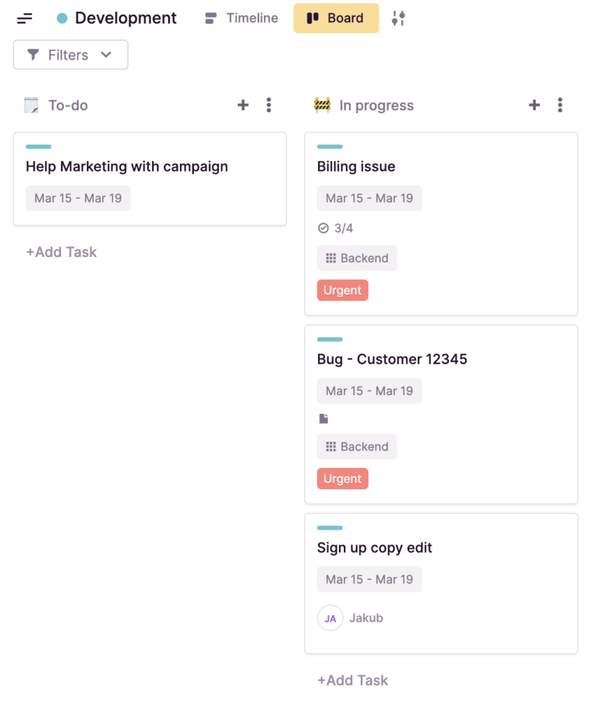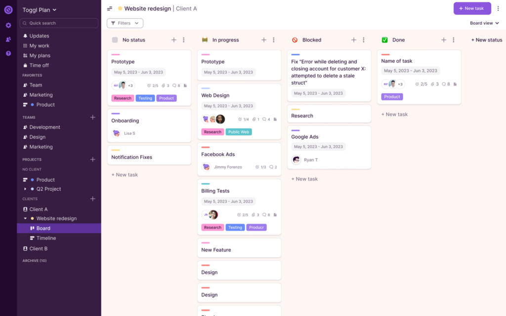 Toggl Plan’s Kanban Boards make it easy to do this by organizing your tasks according to their progress stages: