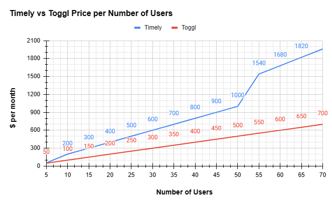Overall, Toggl Track is cheaper because its plans are priced based on features, so the Starter and Premium plans can handle unlimited users. Timely, on the other hand, is priced based on features and users, so as your team grows, switching to a higher plan becomes necessary. Plus, its monthly subscription is outrightly more expensive.