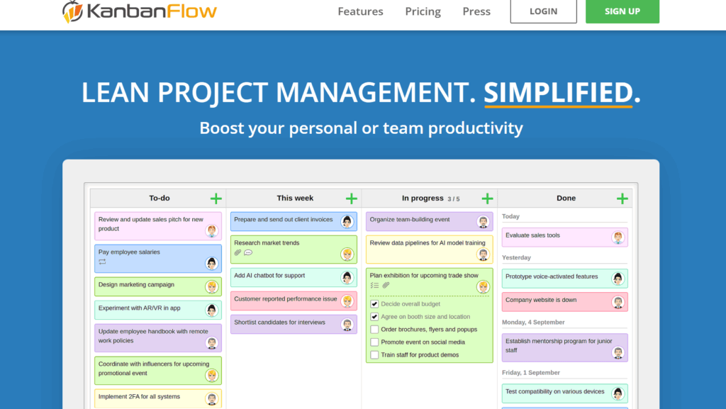 KanbanFlow is a lightweight Kanban tool built around the same fundamentals that make Trello appealing: boards, columns, cards, and a clear view of work as it moves from start to finish. If Trello’s visual simplicity is what drew you in, KanbanFlow will feel immediately familiar.