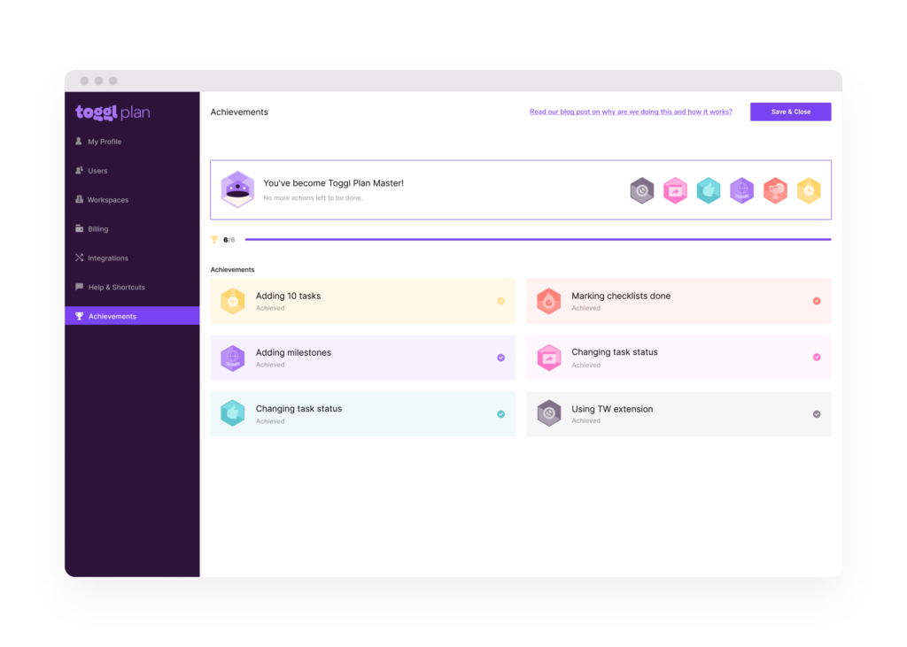 Today, we released our Achievements program that covers everything users need to know about Toggl Plan– so that you’ll feel as confident using the tool as possible. Our users can now learn to use Toggl Plan’s key features in a more fun way, with loads of encouragement. And you can earn a tree on the way.