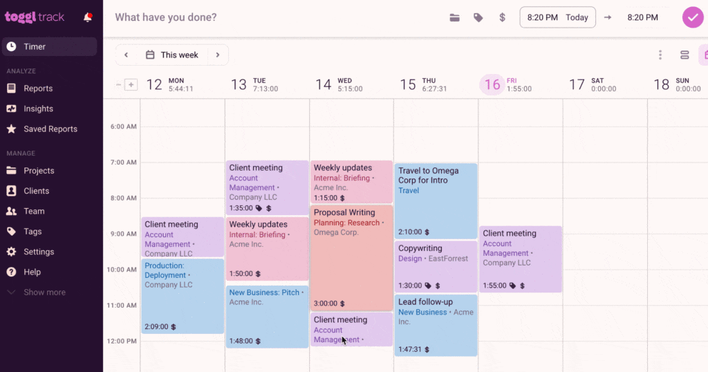 You can conveniently drag and drop time entries to edit or readjust them in the Calendar view.