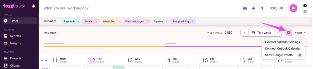 To see time entries in the Calendar view, select “Weekly calendar” or “Daily calendar” on the Timer page, as shown below.