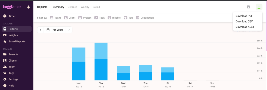 You can choose between Summary, Detailed, or Weekly reports to share with clients in PDF, CSV, or XLSX format.