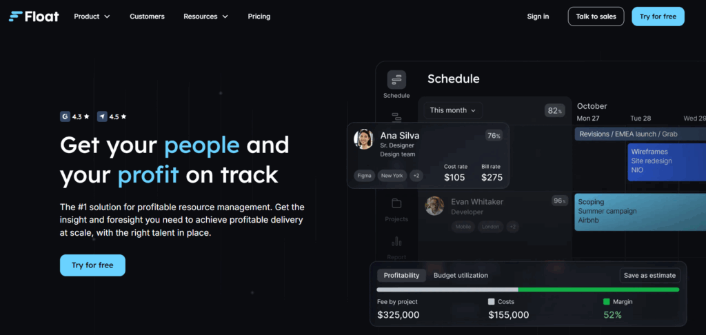 Float is a dedicated resource management and capacity planning tool built to help teams schedule work, manage availability, and balance workloads across projects. Rather than focusing on task-level project management, Float is a strong choice for teams that need clear visibility into who’s available, when, and for how long. There’s a downside: there’s no free plan available, although the starter plan is reasonably affordable.