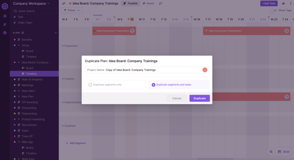 If many of your projects tend to look alike, duplicating an existing plan and simply re-adjusting the dates for the tasks might be a good fit for you. You can find the option to duplicate a plan from the three-dot menu that appears on the sidebar when hovering over the desired plan or in the right-top corner from the three-dot menu in plan view. You’ll then be prompted with a popup that gives you a choice between either only duplicating the plan and it’s segments or also tasks within that plan. By choosing the latter, you’ll create as many new tasks as your old plan had.