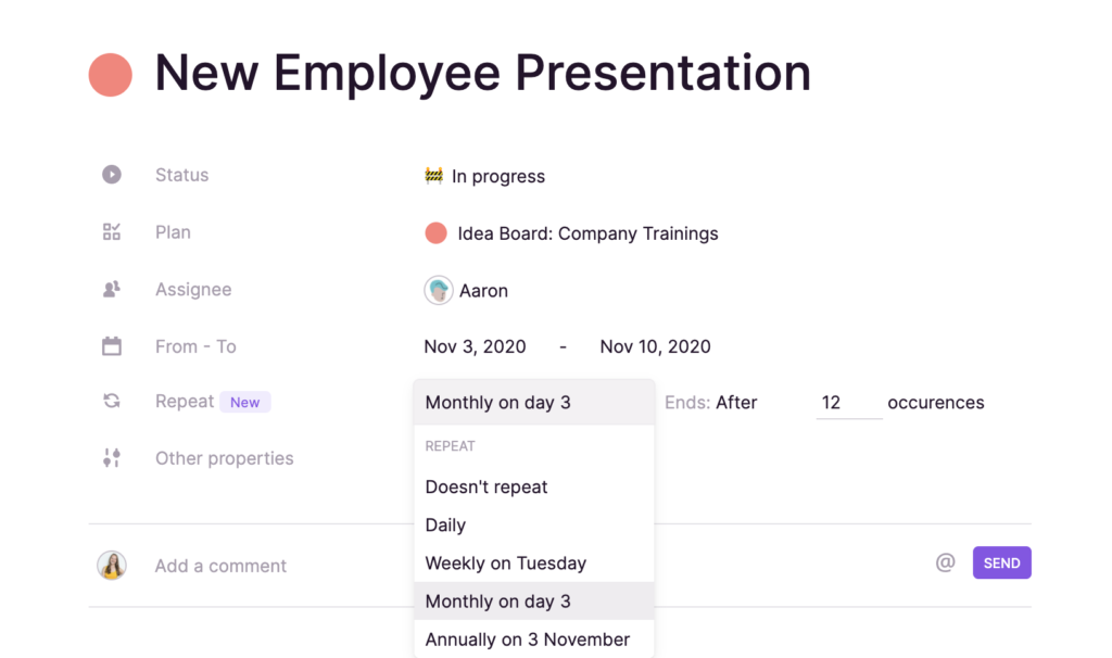 - By making the task repeat, you’ll see it on your timelines at the interval of your choice. Read more about recurring tasks here.