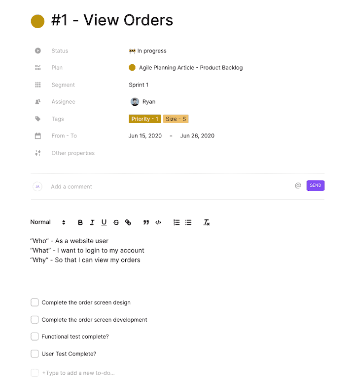 A user story captures the description of a software feature from the end user’s perspective. They can be written in different formats, but the most common is the ‘who’ ‘what’ ‘why’ format. Here’s an example: