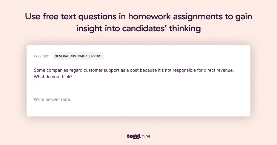 Alternatively, you could swap homework assignments for paid test projects. While many candidates frown upon the idea of completing longer take-home tasks for free (who doesn’t hate free labor?), paid projects are generally accepted as a reasonable alternative. Learn how we leverage paid projects at Toggl Hire.