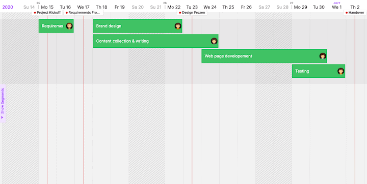 Here’s how a simple website design project roadmap looks on the Toggl Plan timeline.