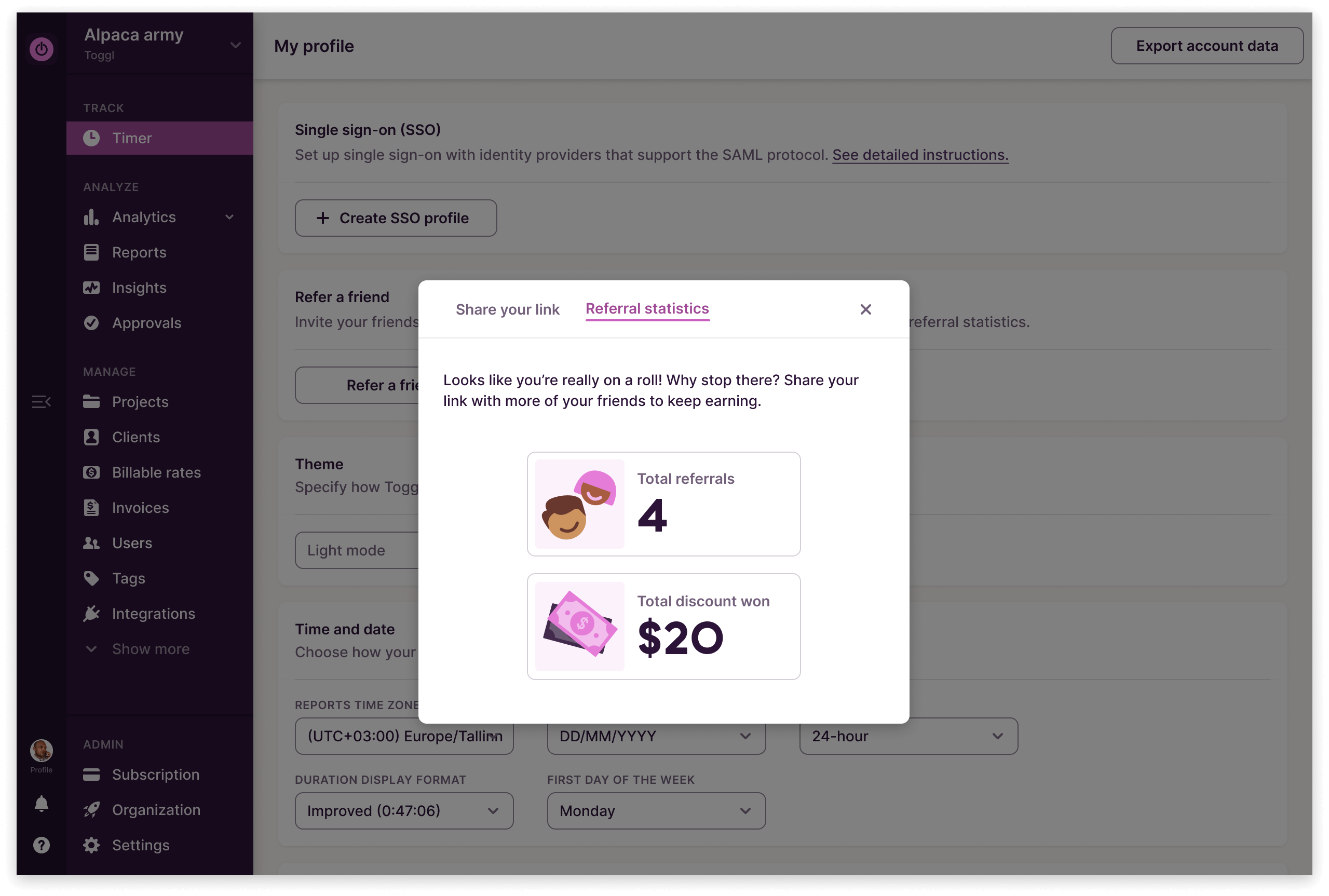 Invite your friends to try Toggl Track. If they upgrade to a paid plan, you both get $5/€5 in credit, automatically applied to the Toggl Track organization you own.